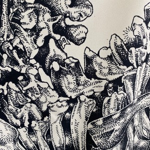 骨・植物・動物等、有機的なモチーフをペンで描く作風で、