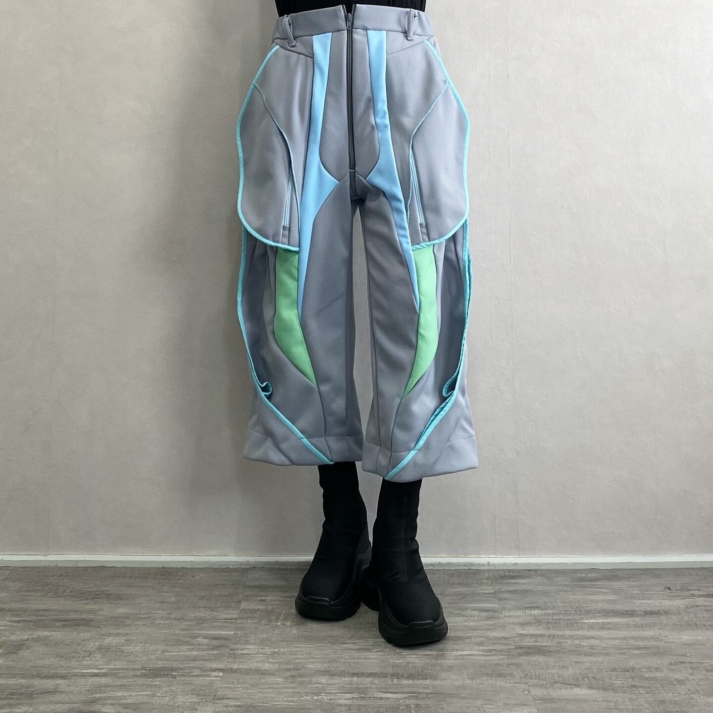 多用な切り替えパーツで構築されたクロップ丈のパンツです。
