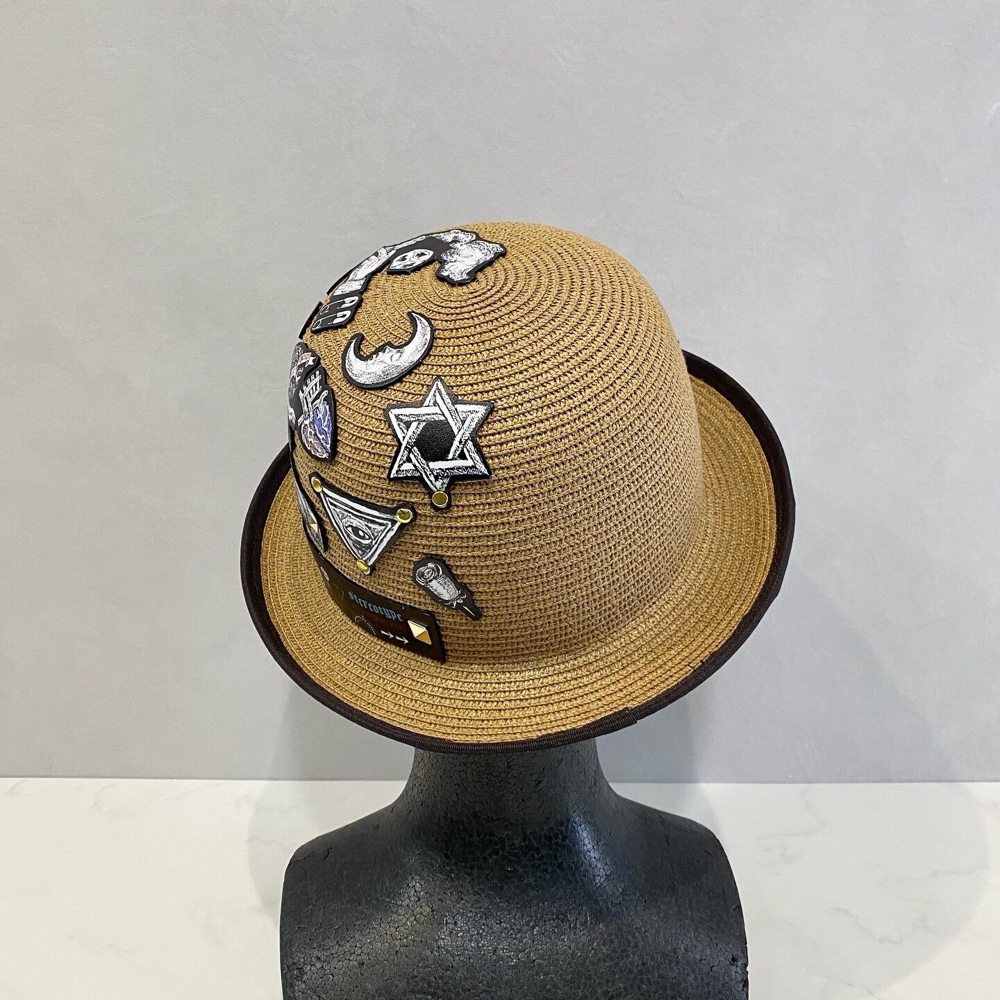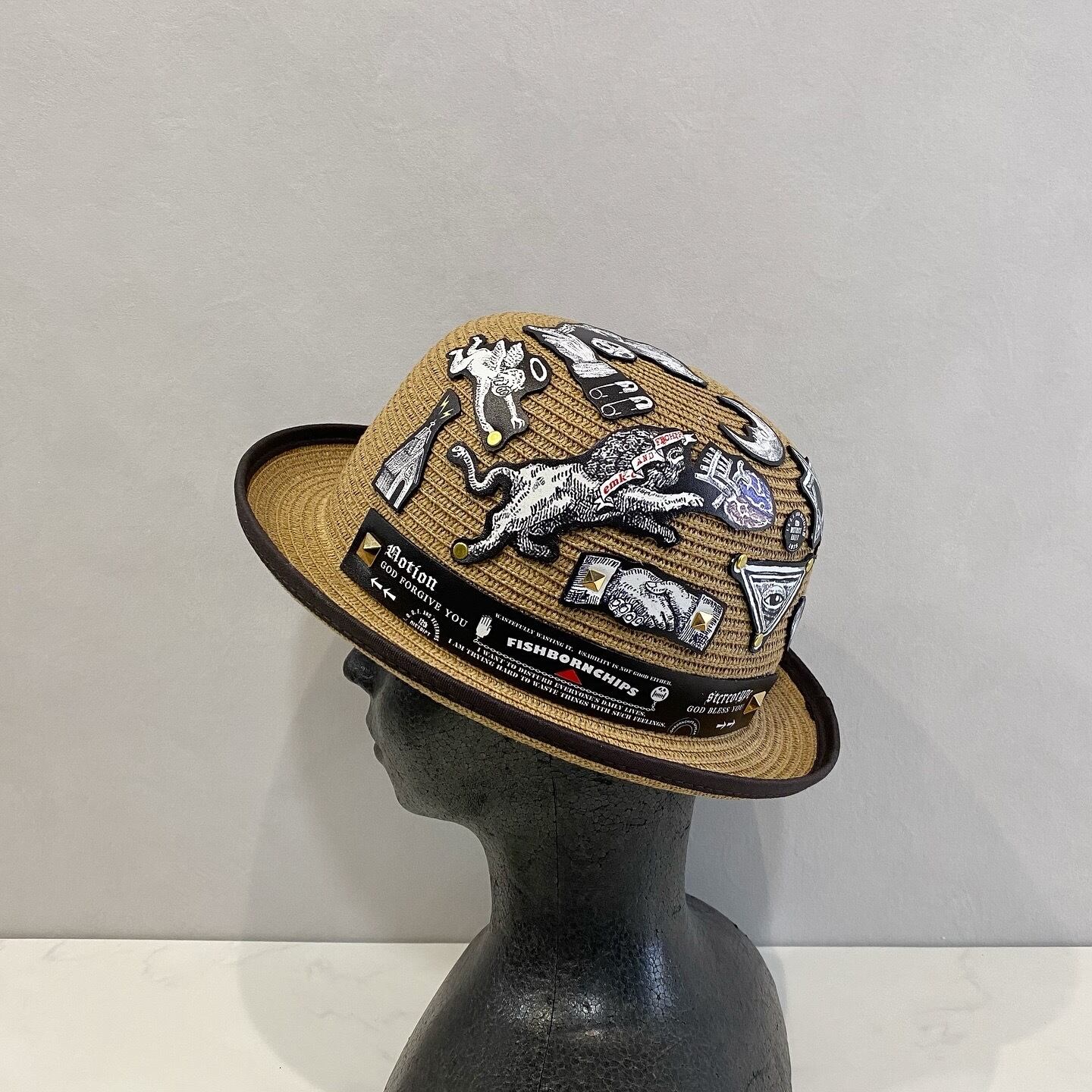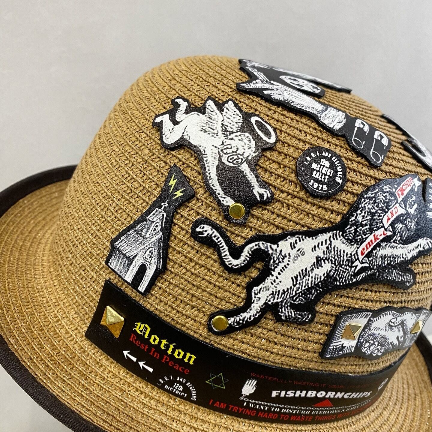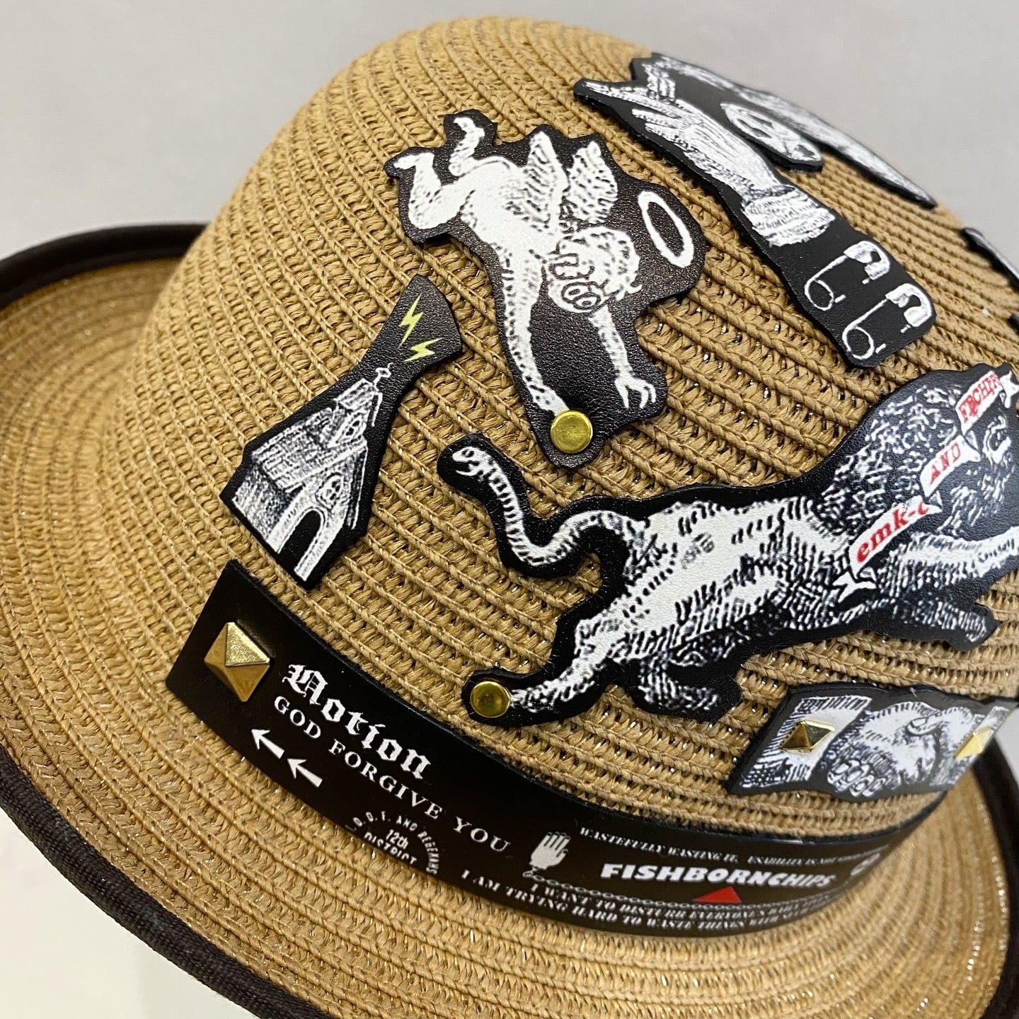 本革にプリントを施したパーツをコラージュした夏物ボーラーハット!