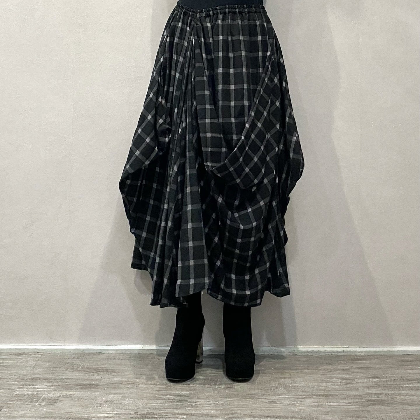 大胆なドレープが効いたデザイン性の高いスカート。