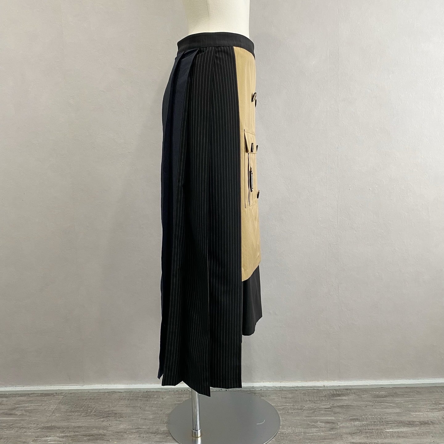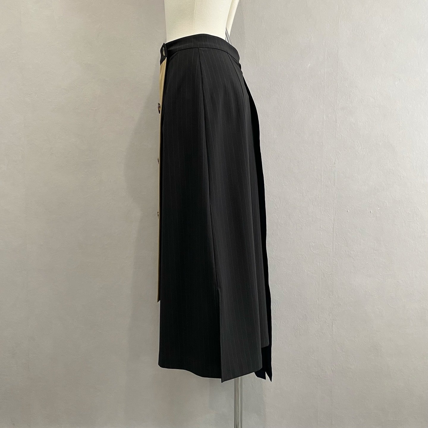 異素材を切り替えた ロング丈の巻きスカートです。