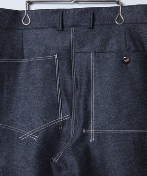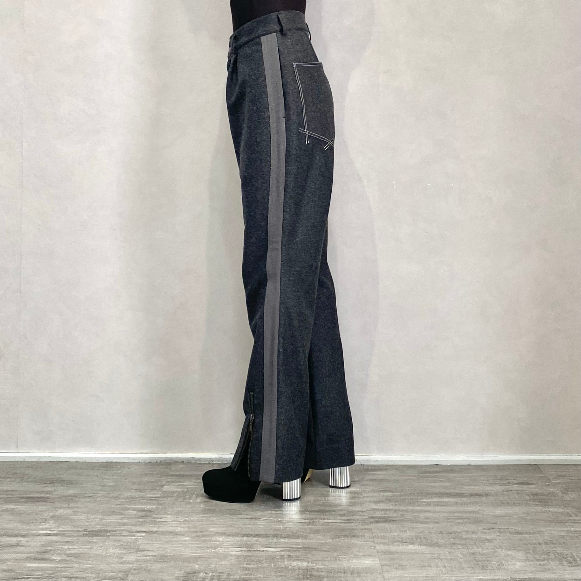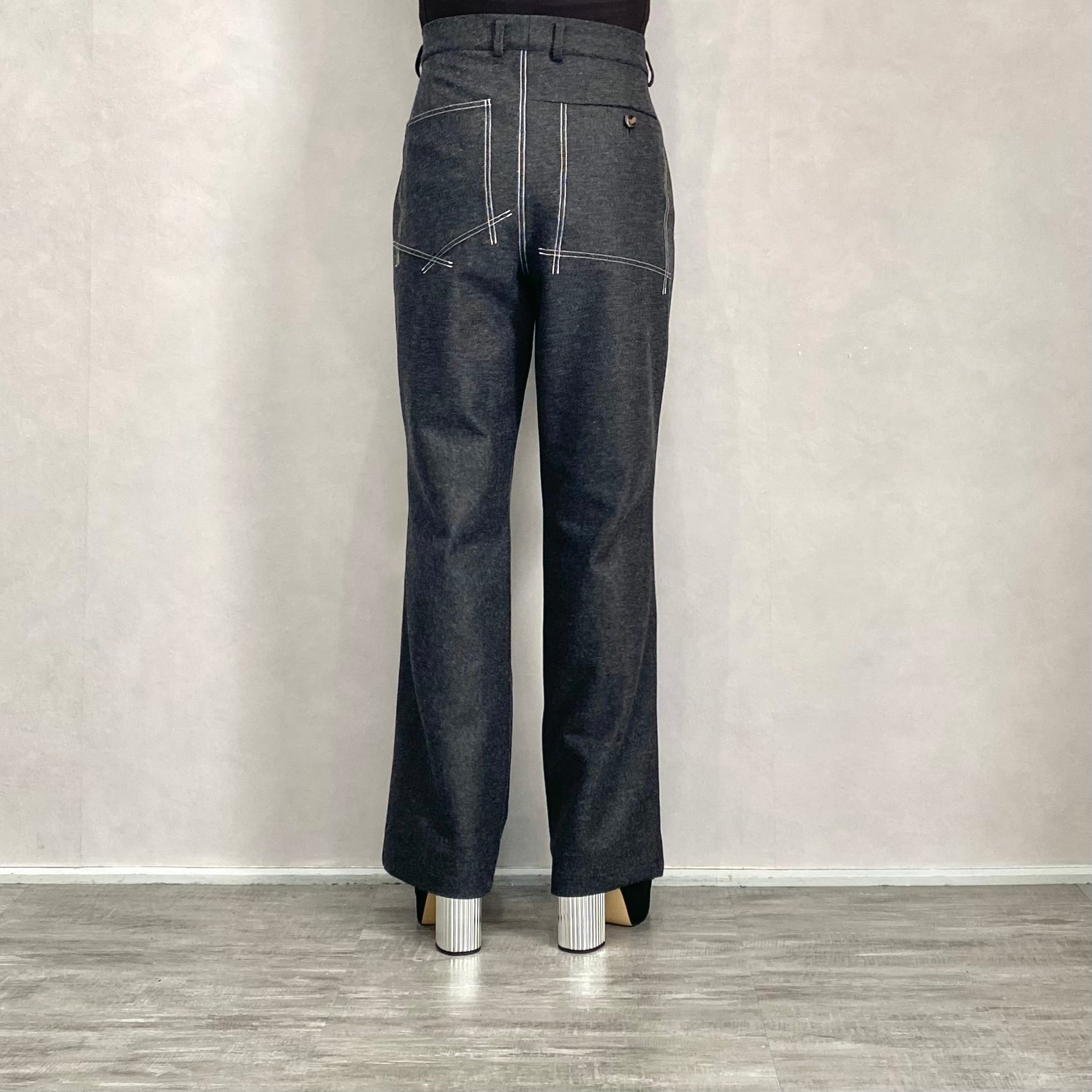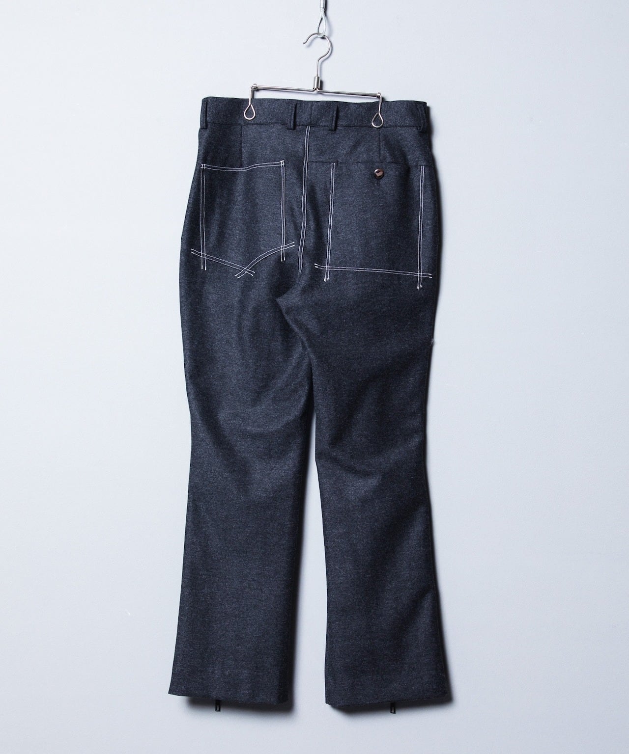 ジーンズのような縫製仕様や微妙なフレアシルエットをスラックスに落とし込んだデザイン。