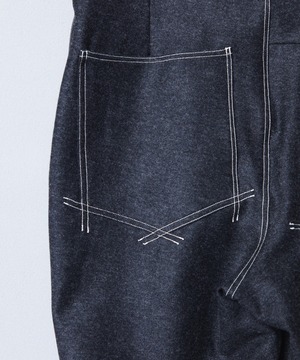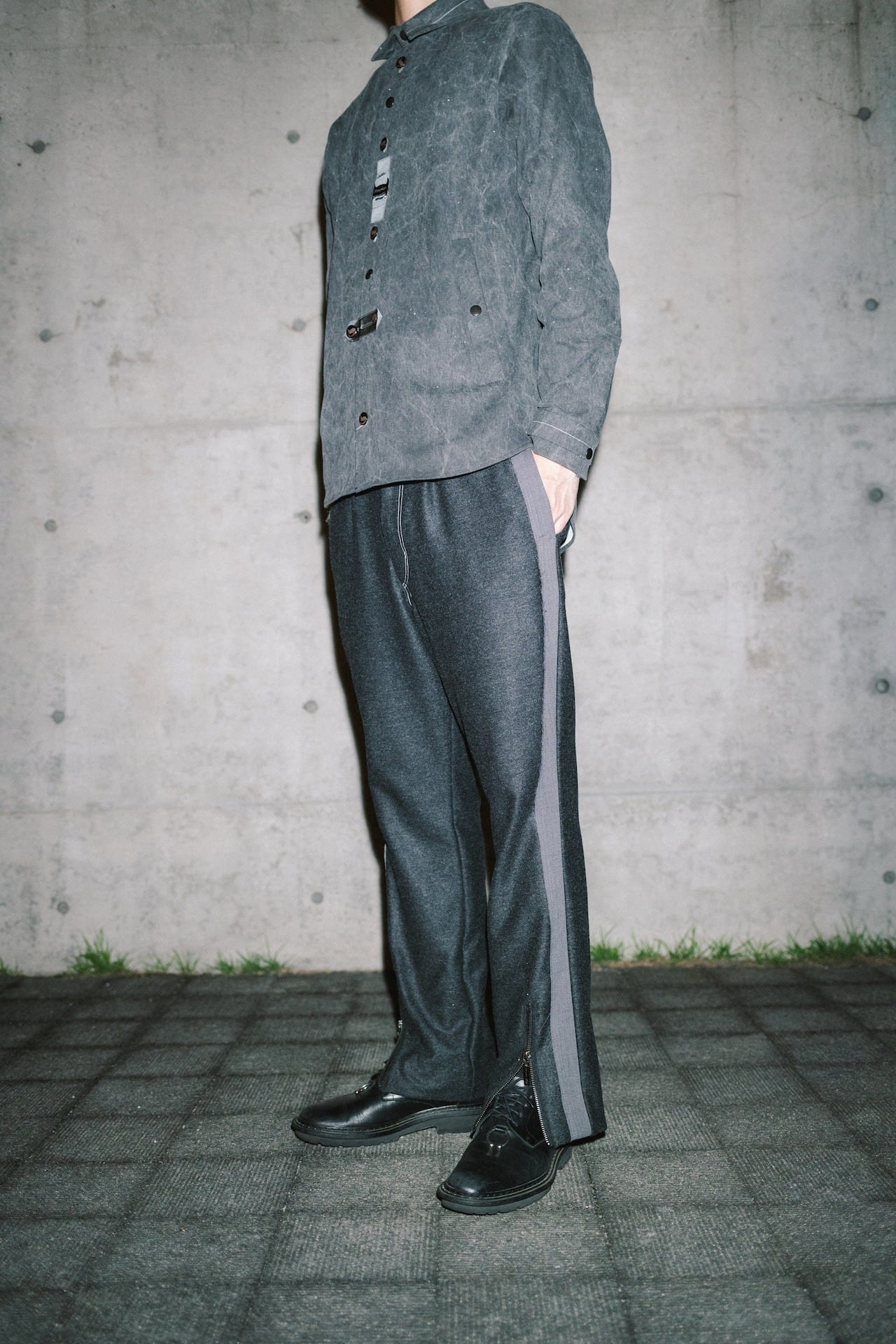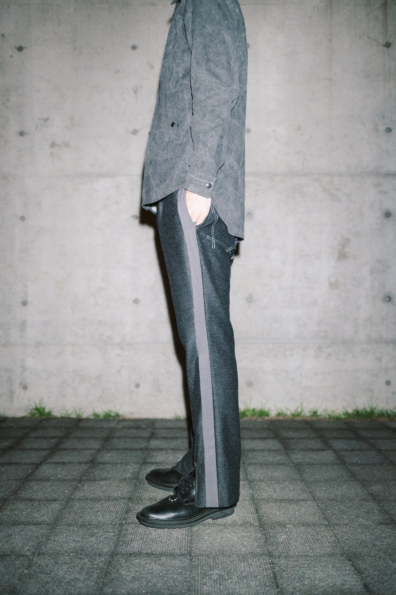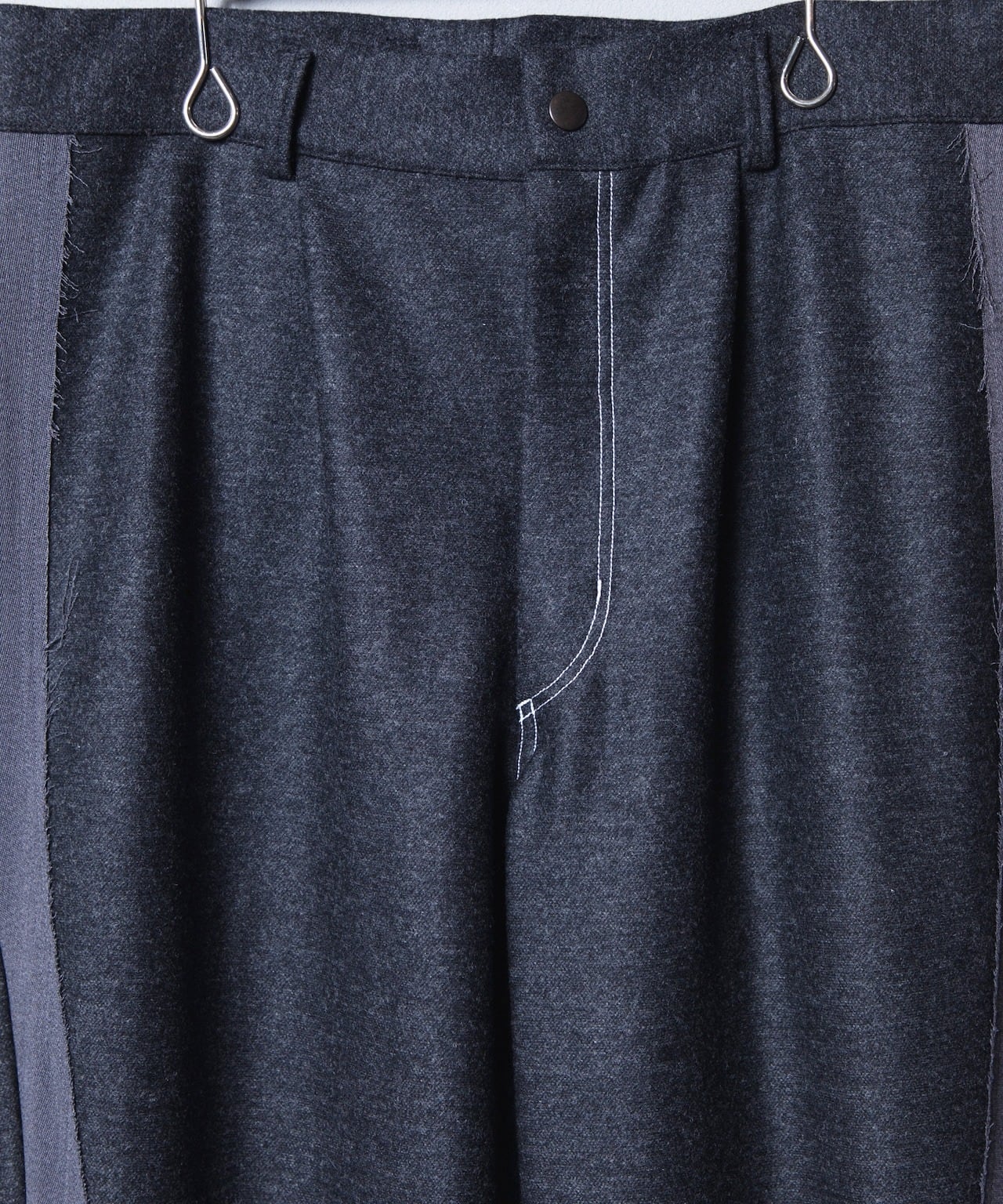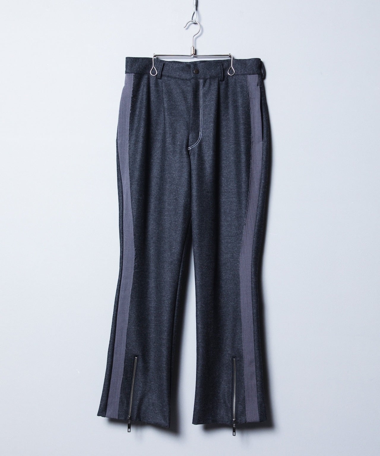 ジーンズのような縫製仕様や微妙なフレアシルエットをスラックスに落とし込んだデザイン。