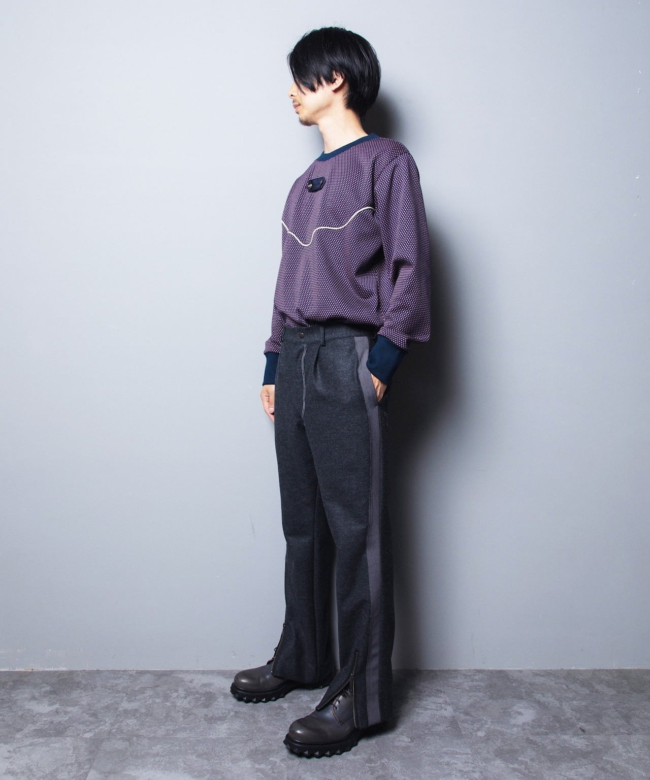 脇には、ウールとポリエステルの混紡による無地素材を挟み込み、ラインパンツ仕様に。