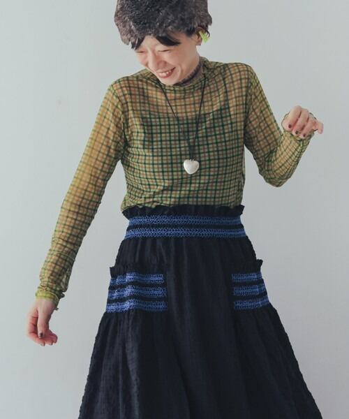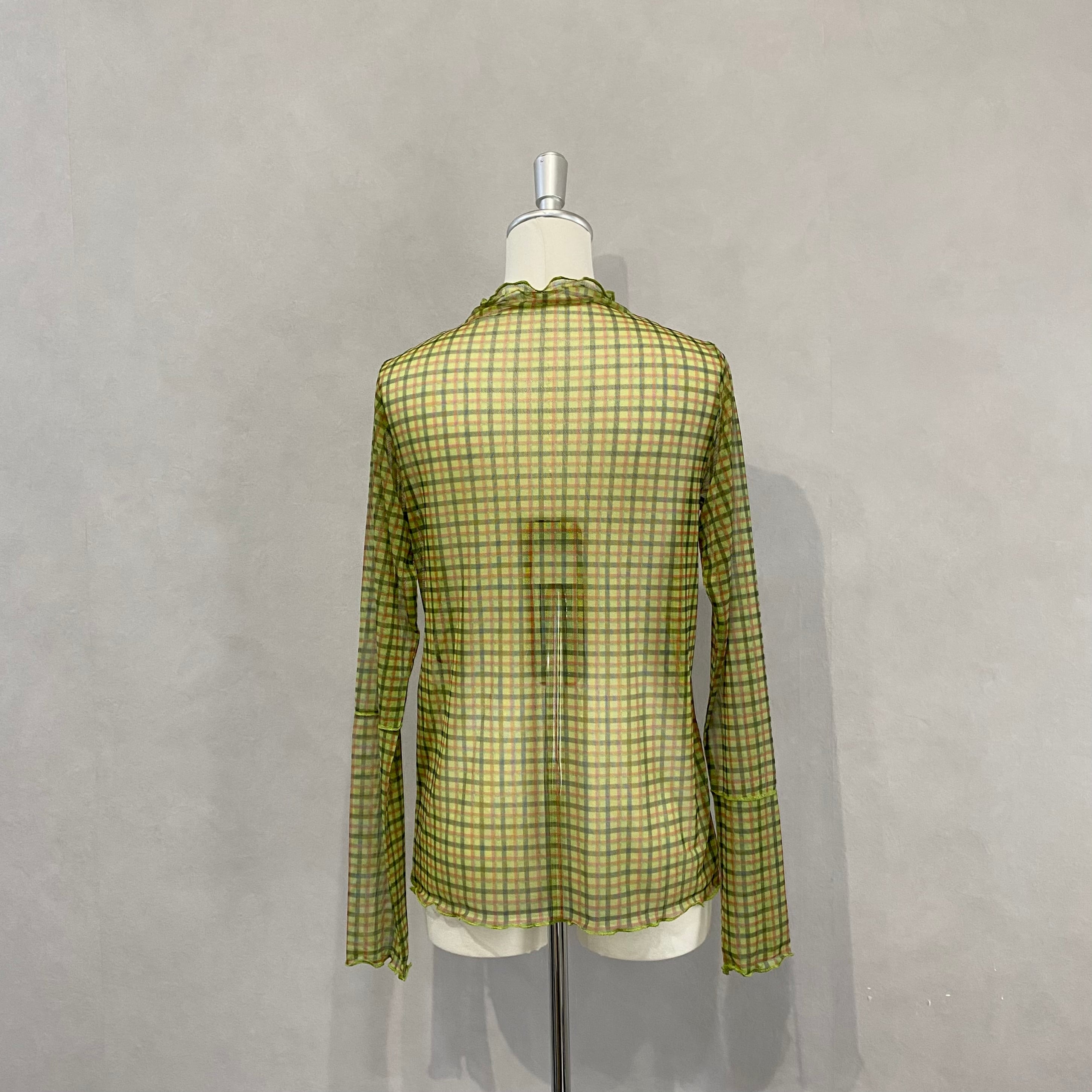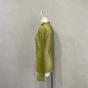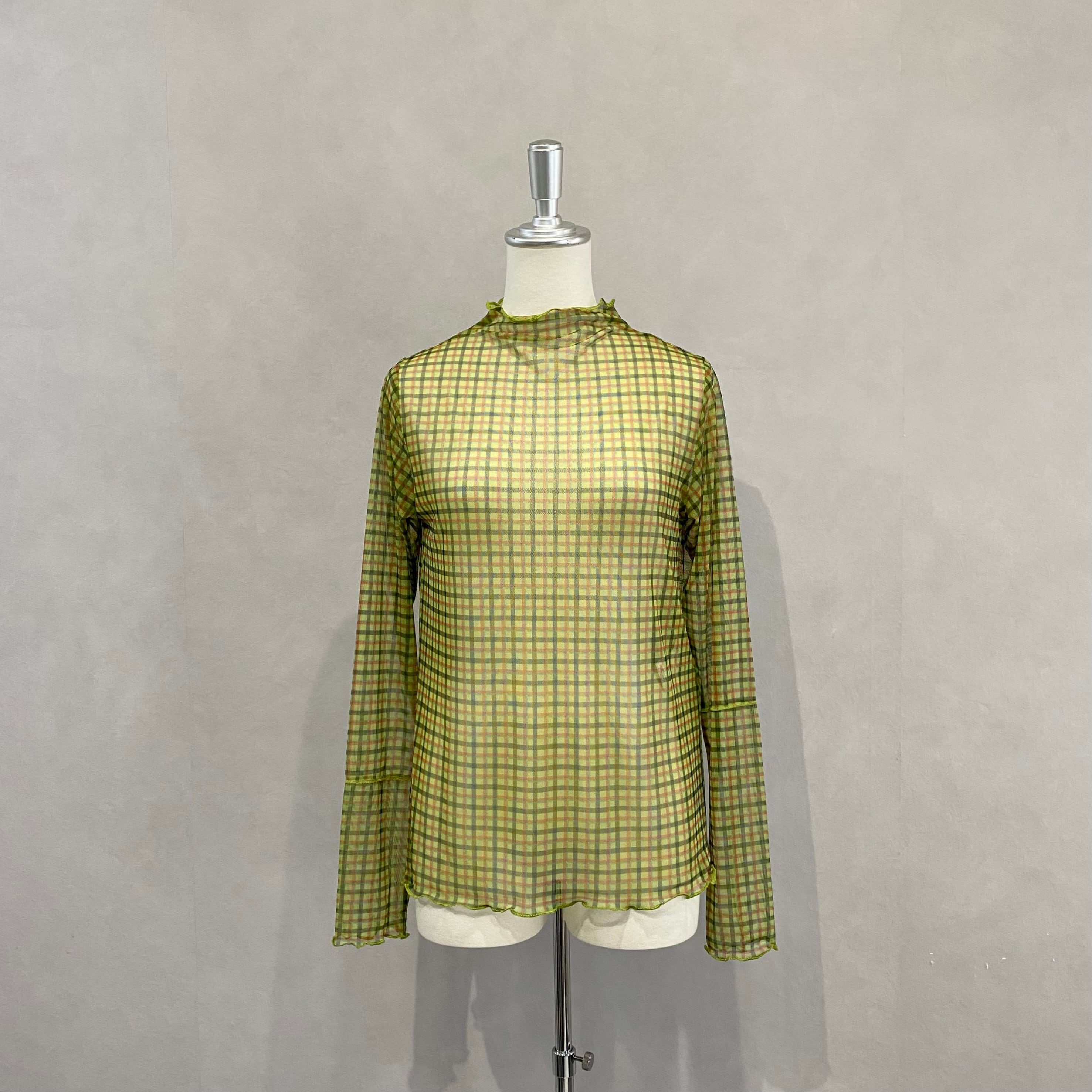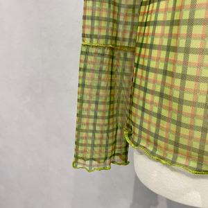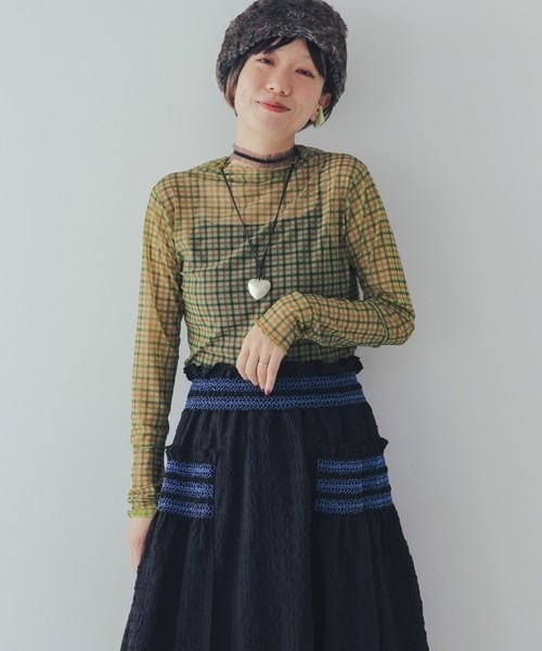 シアー感のあるチェック柄の生地を使用したカットソーは