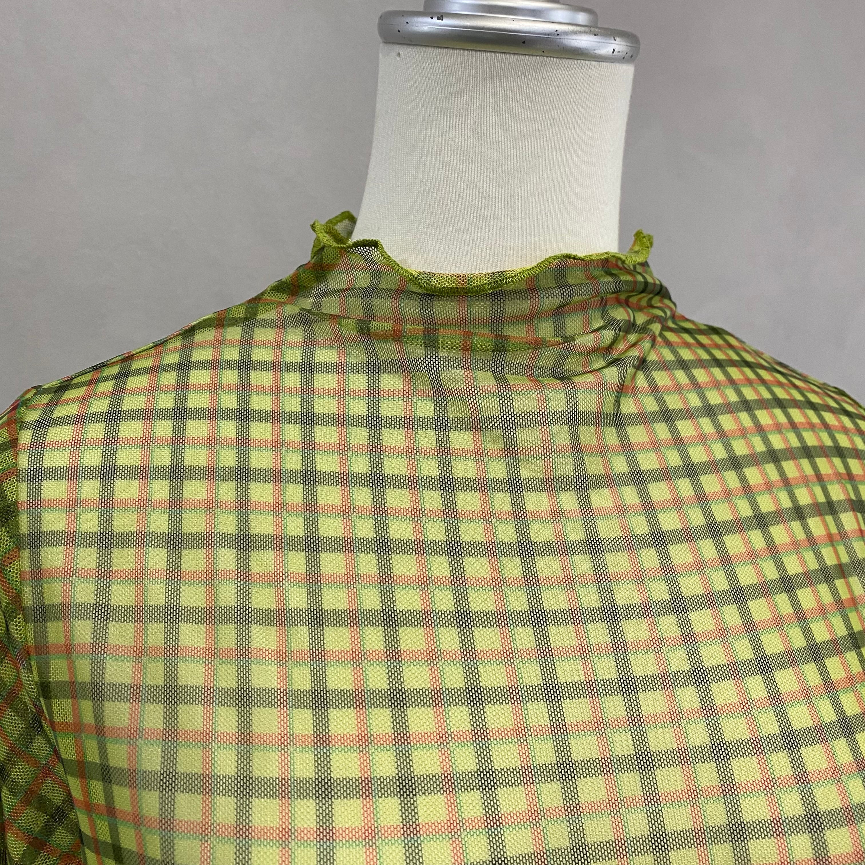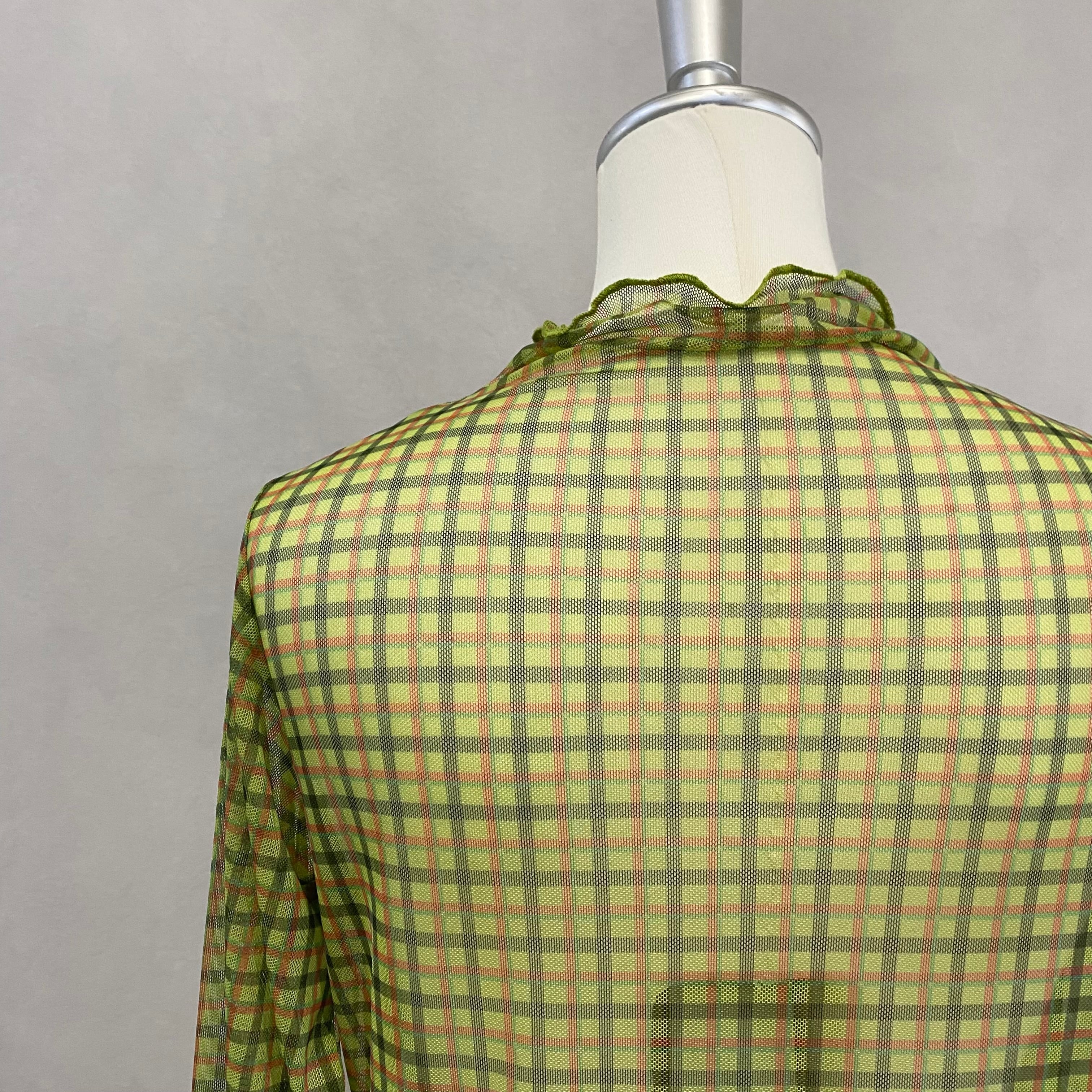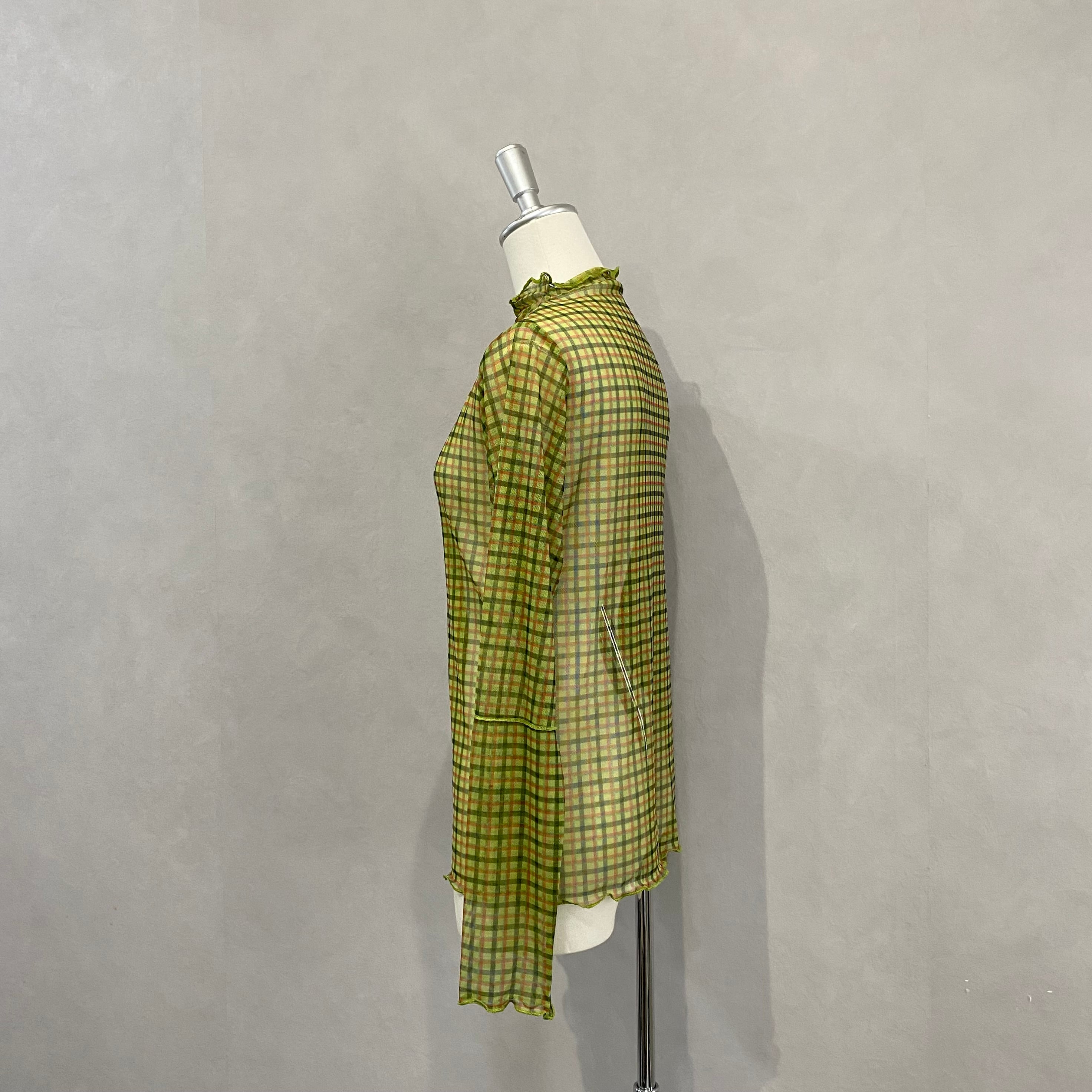 シアー感のあるチェック柄の生地を使用したカットソーは