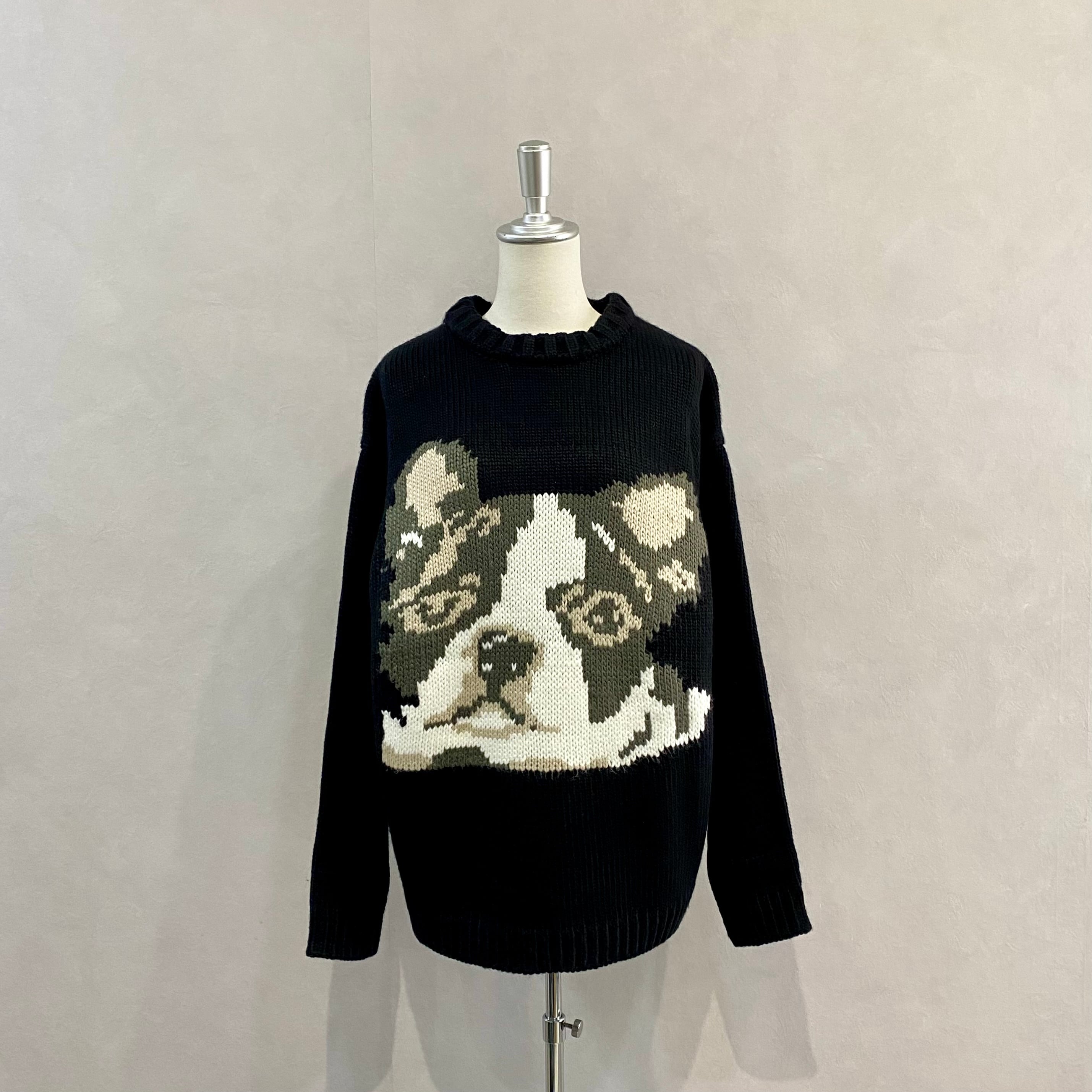 大胆にフレンチブルドッグを編み込んだ、存在感抜群のざっくりニット。