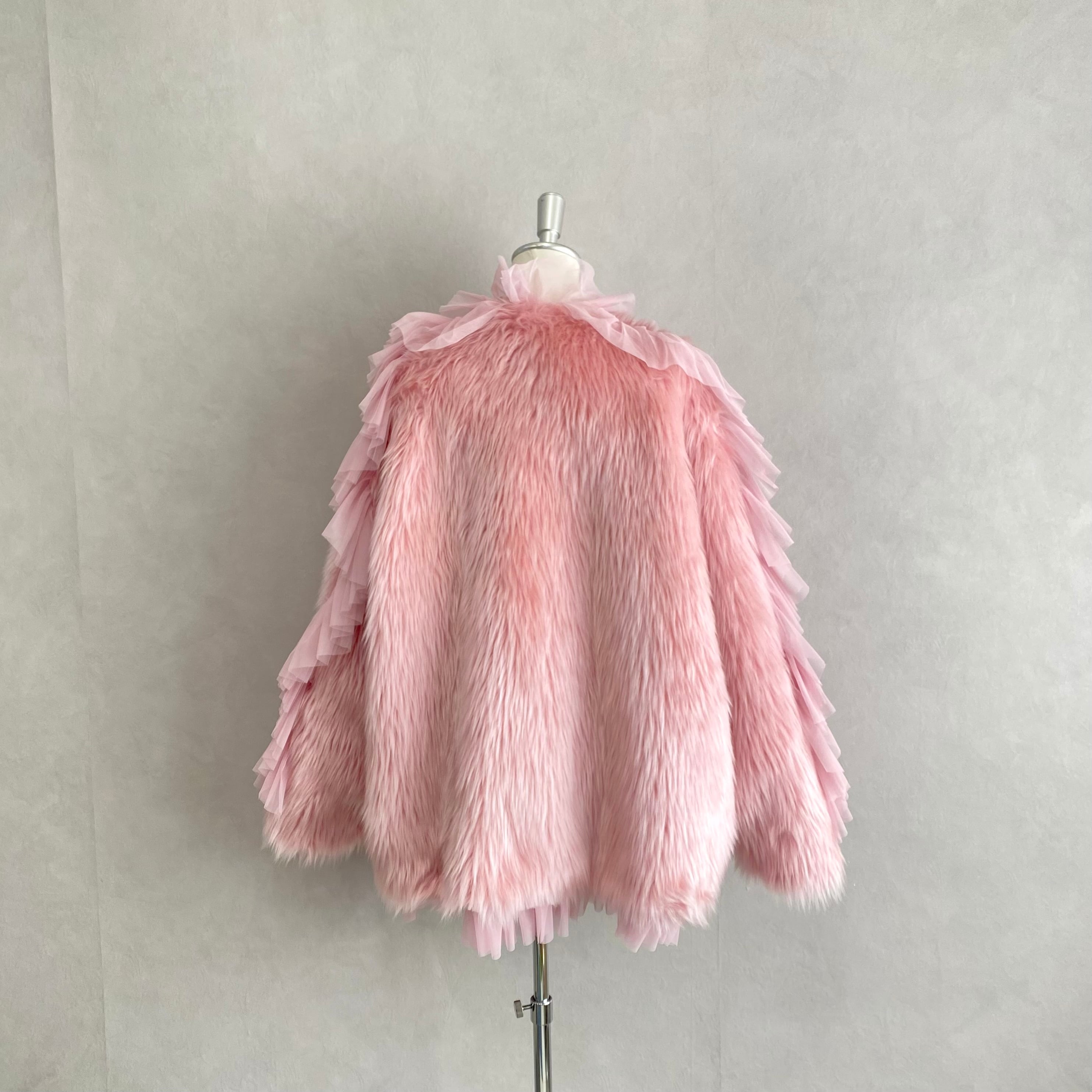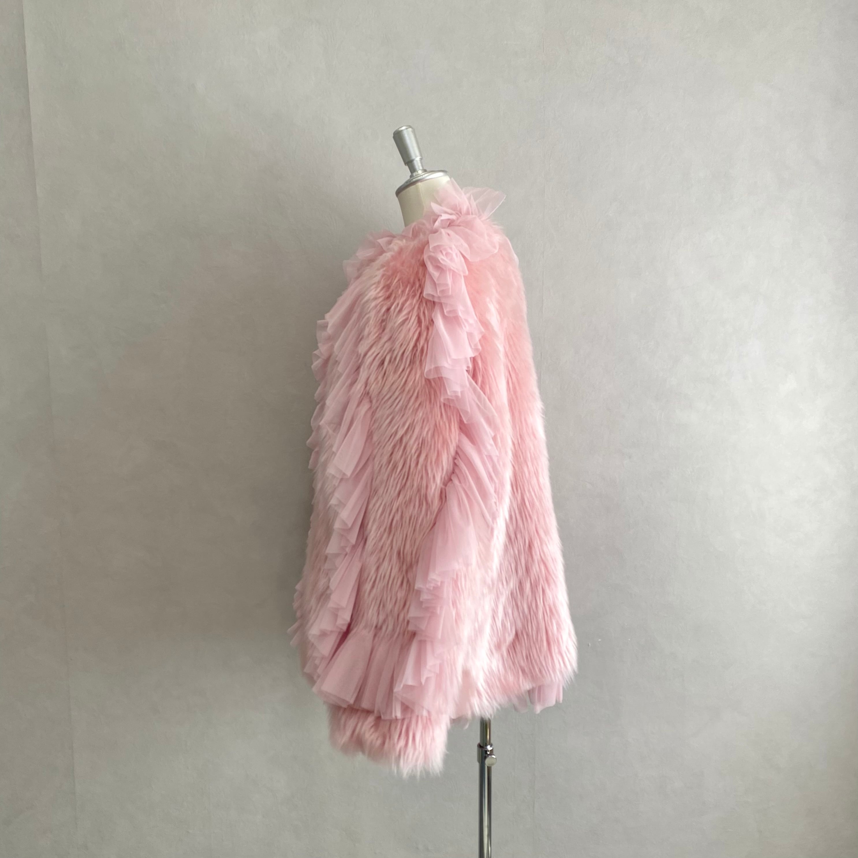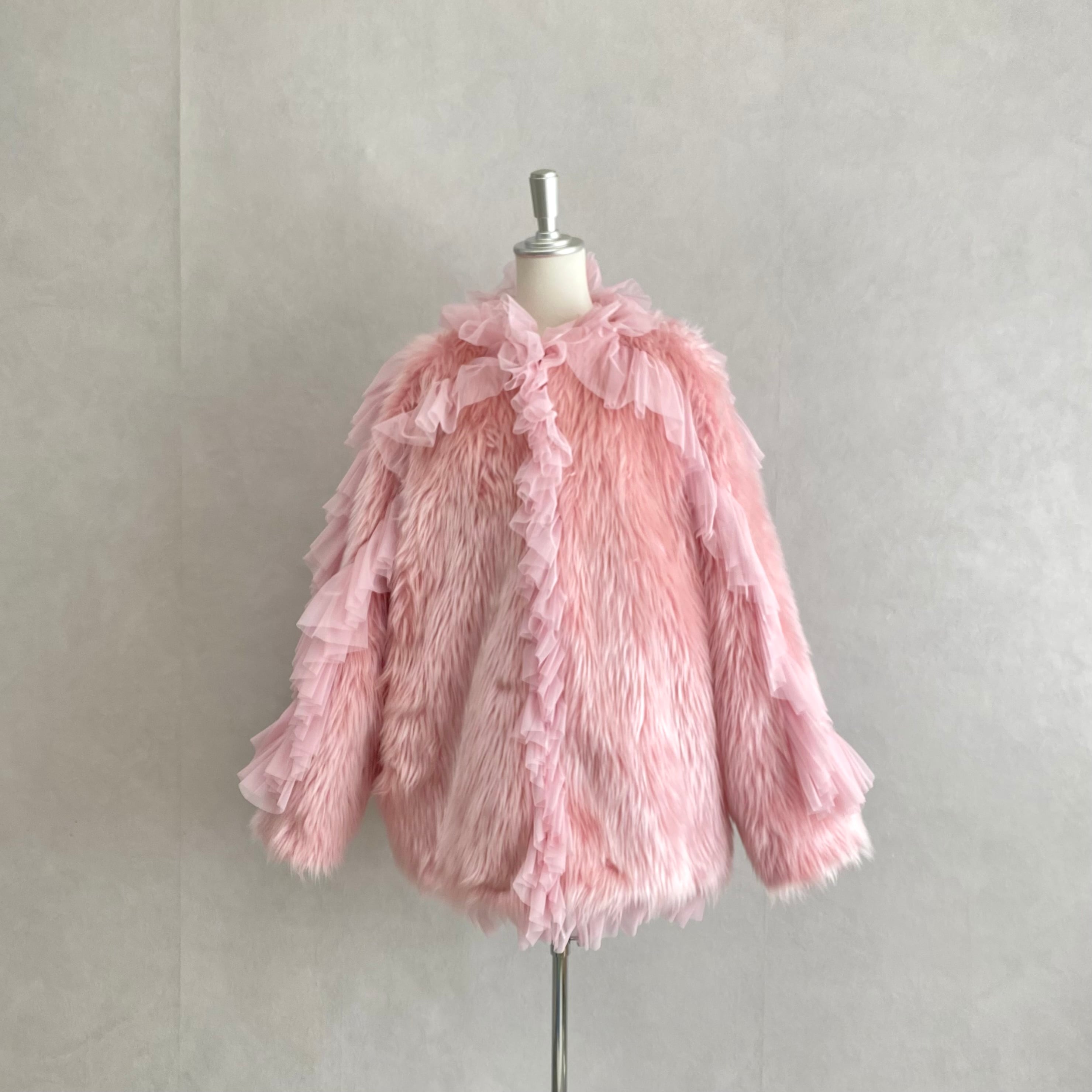 faux fur にネットのラッフルをあしらったファージャケット。