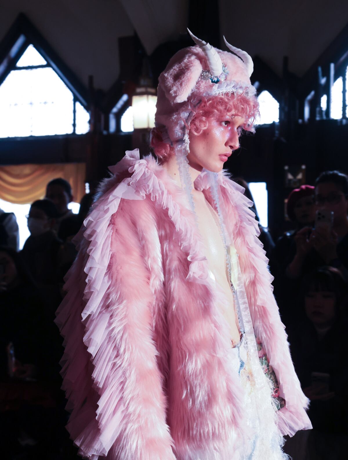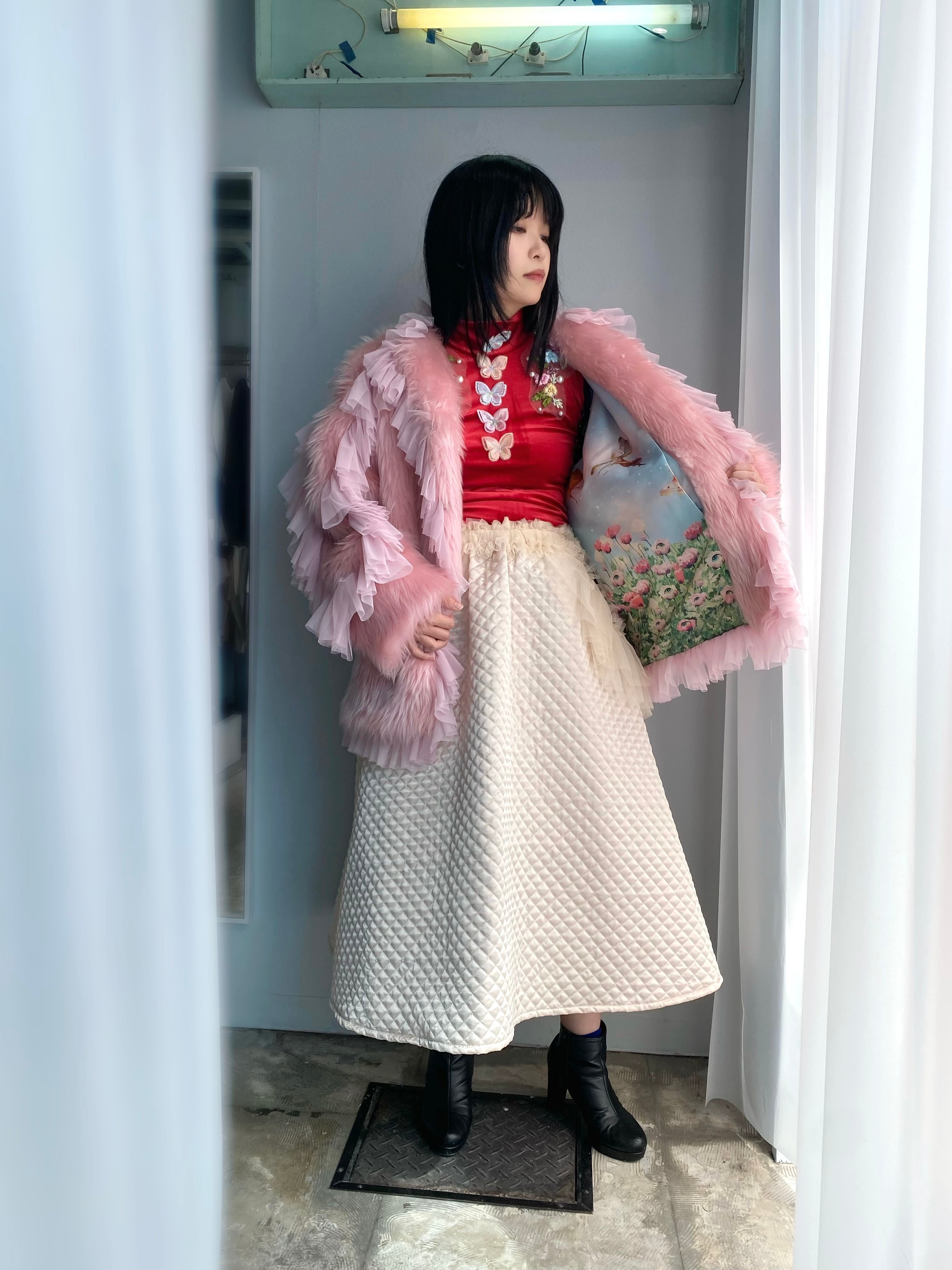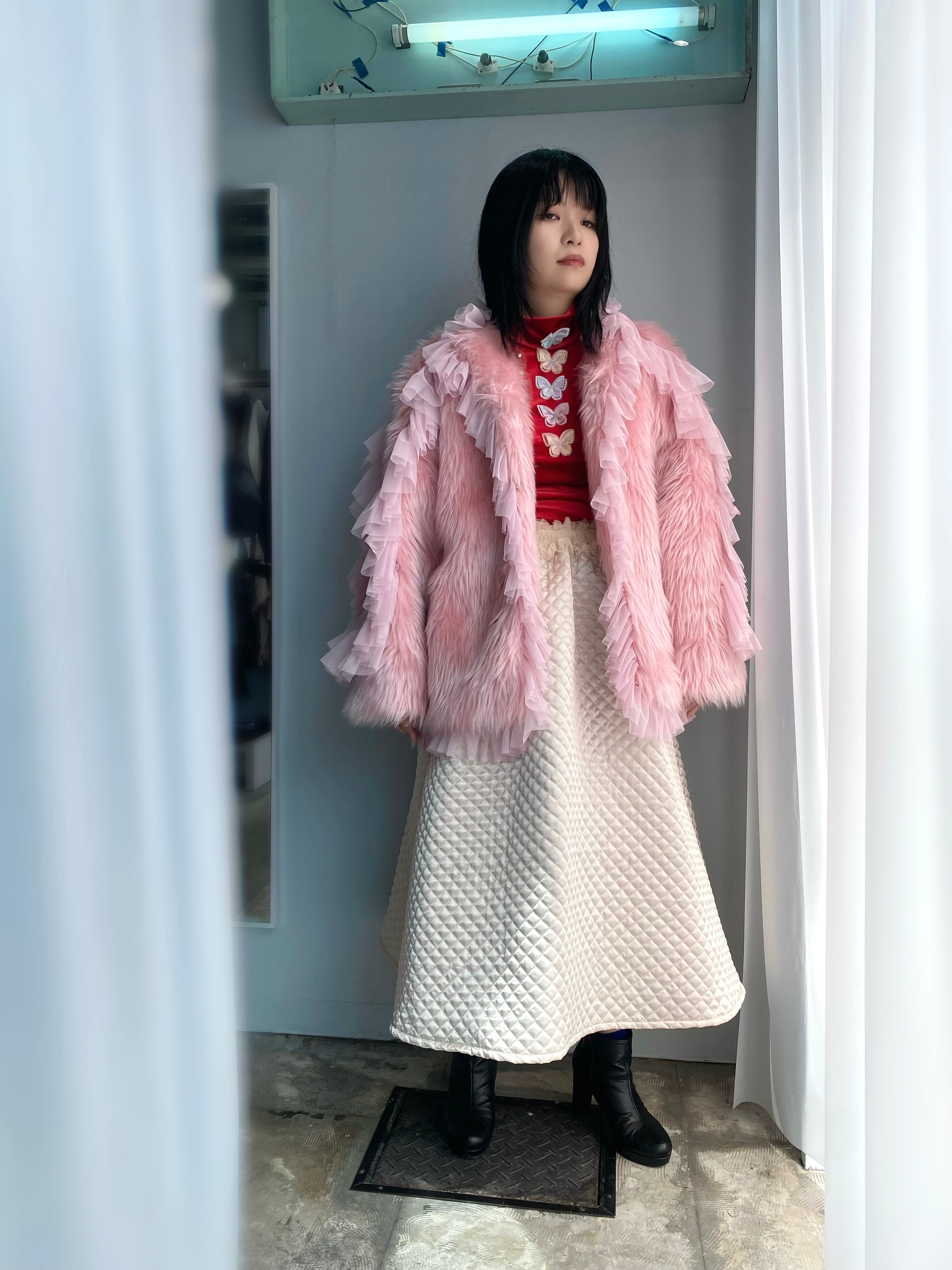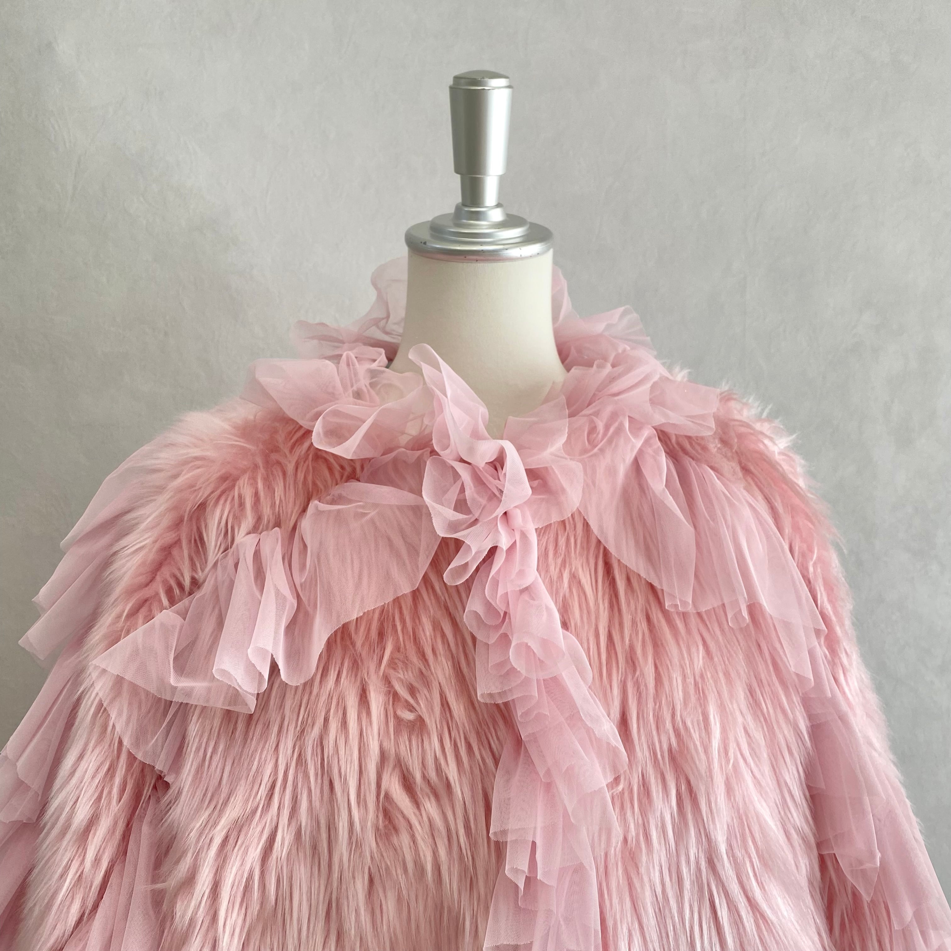faux fur にネットのラッフルをあしらったファージャケット。