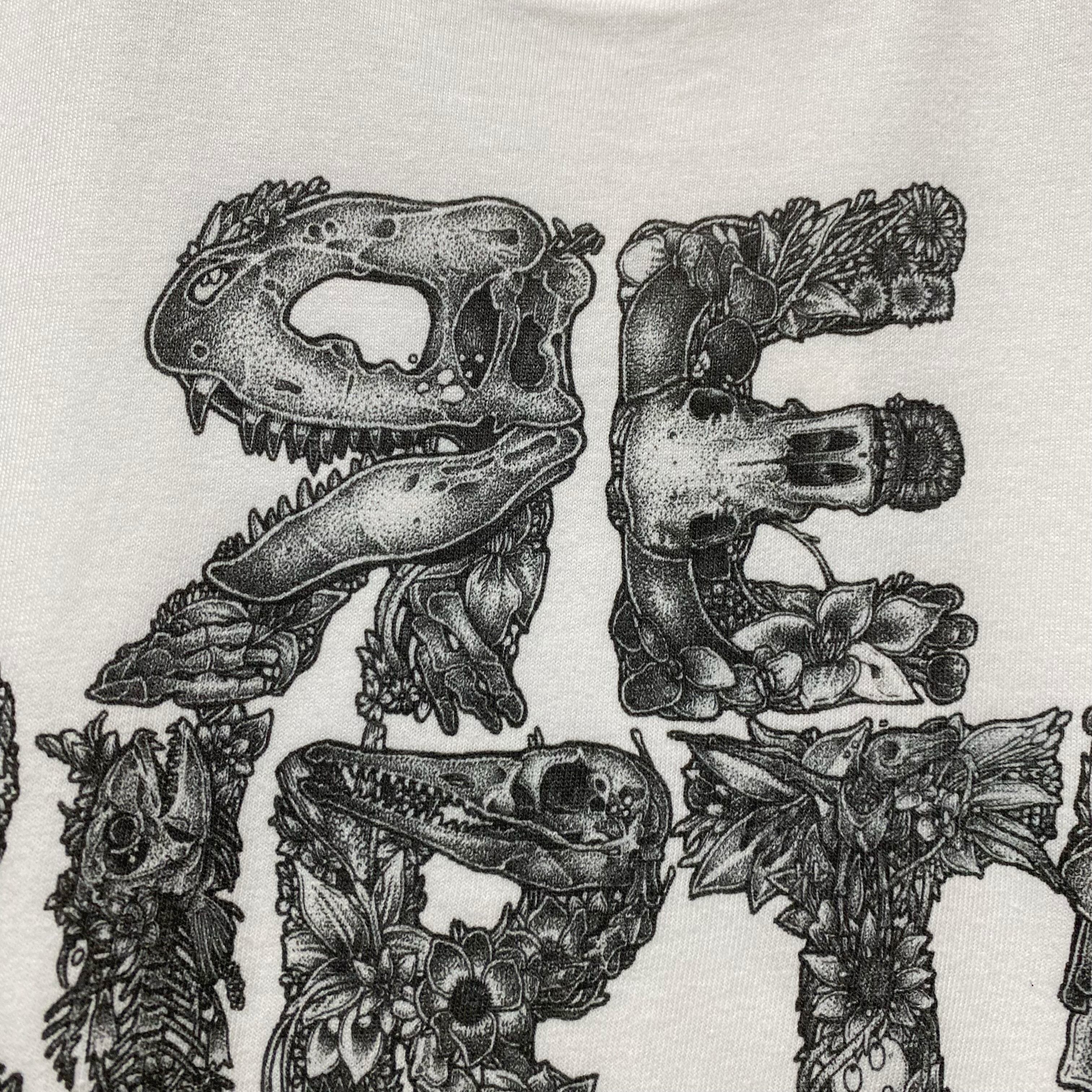 恐竜の骨や植物をコラージュしたような緻密なイラストです。
