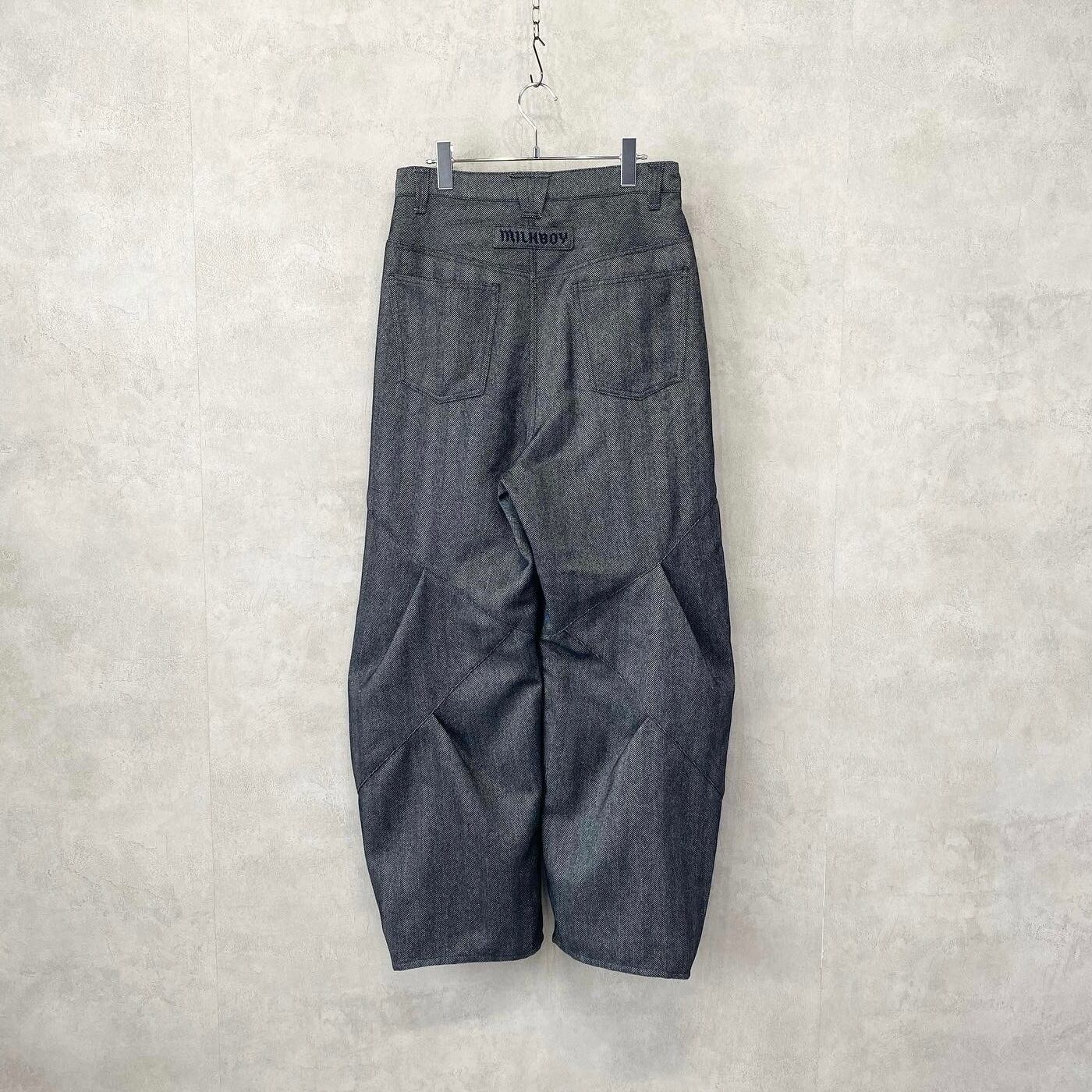 ひざ下から広がるように切り替えが組まれたデザインパンツです。