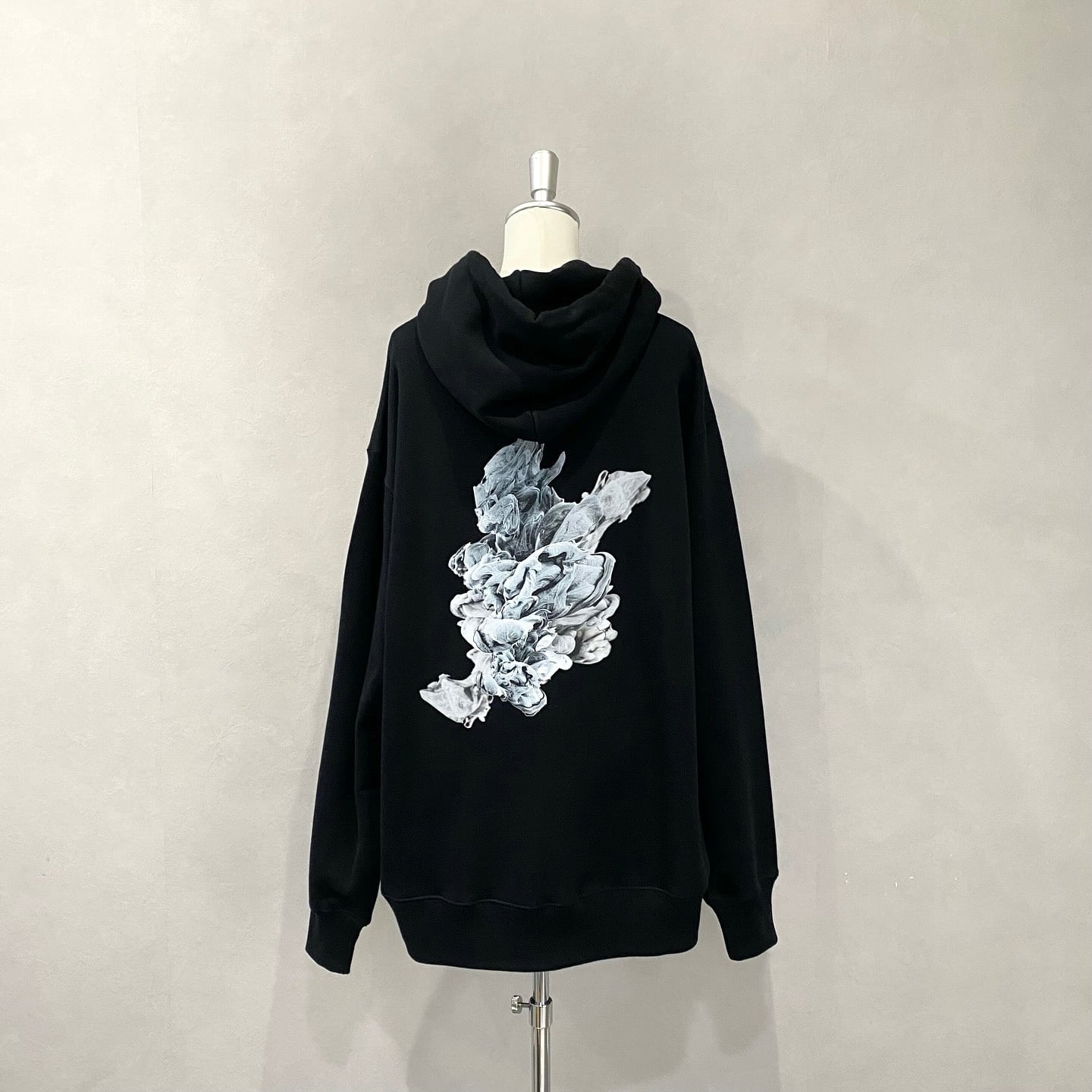 水彩画のような抽象的なグラフィックを背面に配したフーディです。
