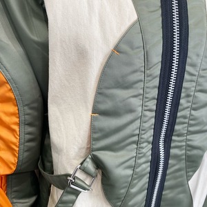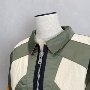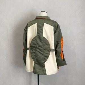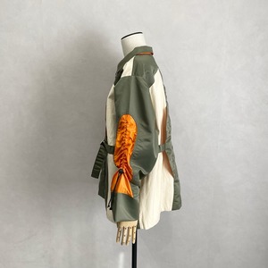 襟・フロント・背面のカーキ色パーツの裏面にはオレンジ色の生地を配置しており、